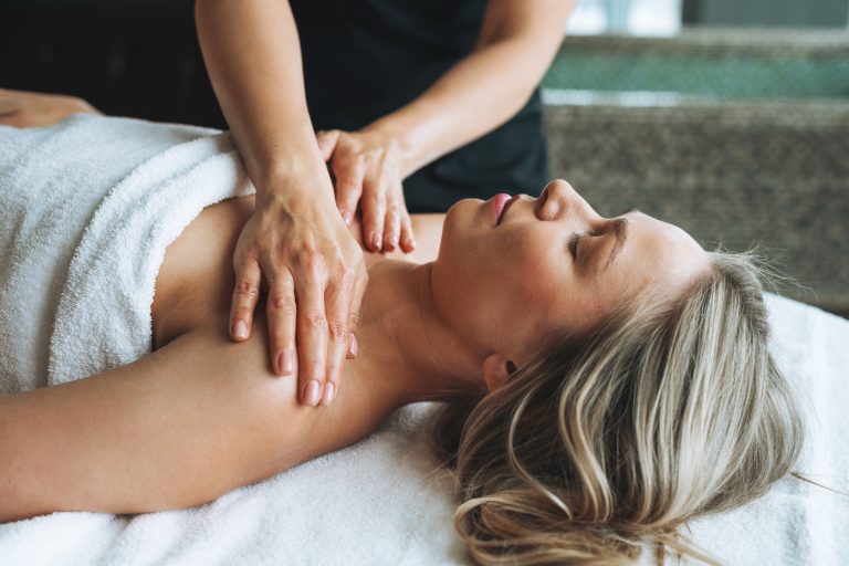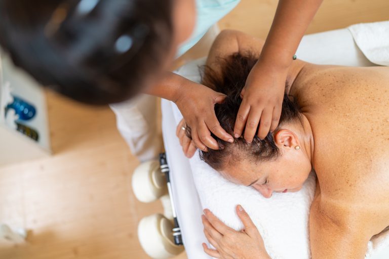 Neck massage female in SPA salon. Massaging therapist makes neck therapy mass for woman. Sensual healthy massaging in hands of professional masseur. Concept of healthy lifestyle and beauty. Copy space