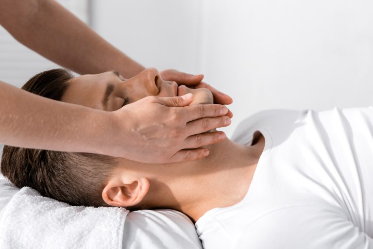 Beautiful elegant female lying on white towel while getting pleasant sensation while male massage therapist making manual massage with black tools in beauty clinic