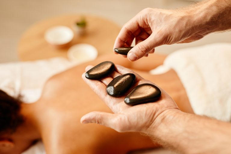 Close up of male hands laying stones on back of young woman in relaxing SPA session, copy space