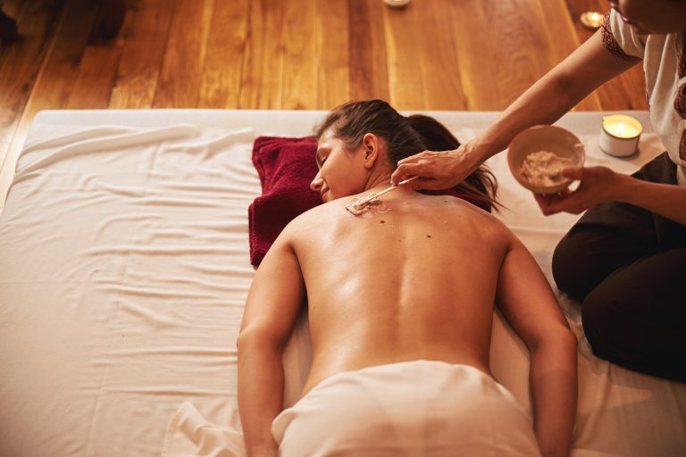 indian woman getting ayurvedic massage in tropical resort in India Goa.