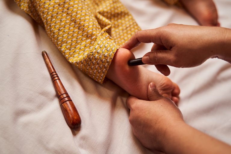 Young woman lying while enjoying the acupressure techniques of traditional Thai massage at spa and wellness center