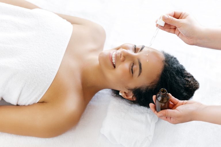 Close up of young African American woman enjoying massage in relaxing SPA session and smiling