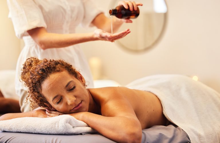 Spa, luxury massage and woman with essential oil getting back massage for wellness in beauty salon